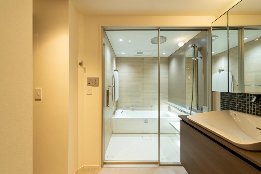 入室と同時に足元のライトが柔らかく灯り、夜間も安心です。