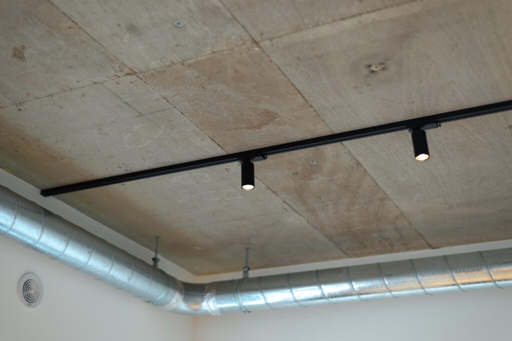 黒のダクトレールとスポットライトが空間を引き締め、無機質な素材の魅力を際立たせる。