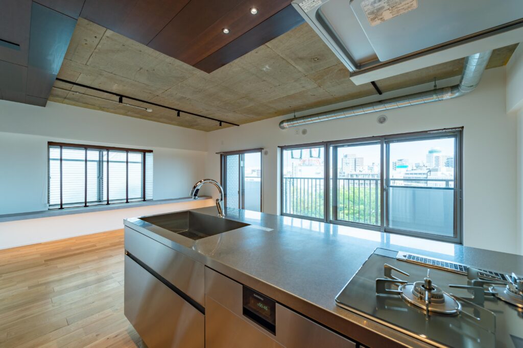 視界を遮るもののない、ペニンシュラタイプのオープンキッチン。
