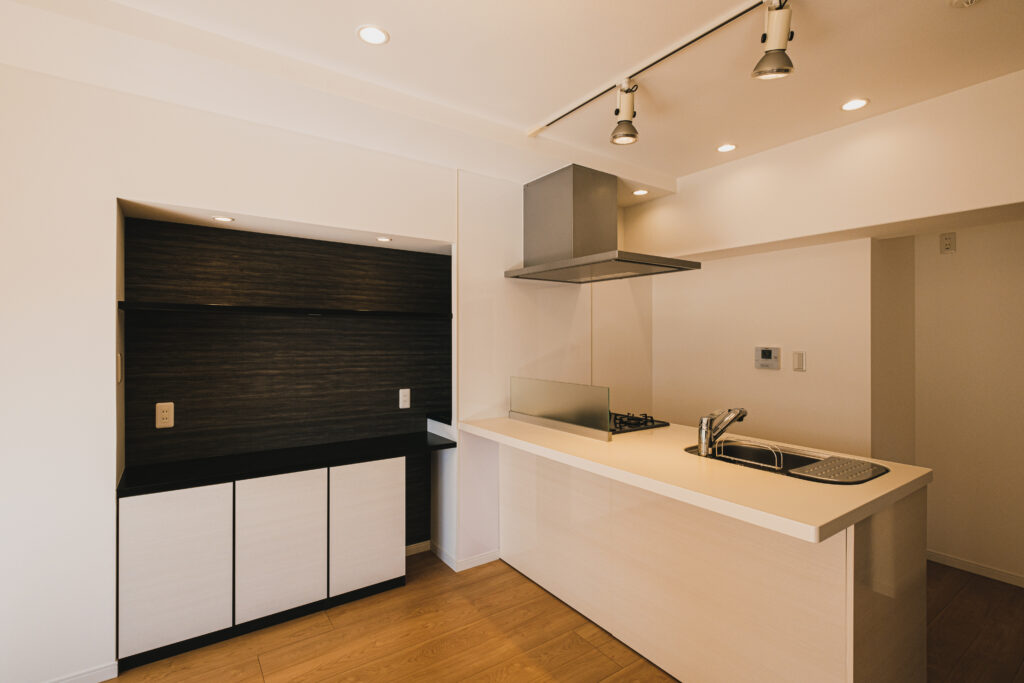 キッチン横には、テレビカウンターと収納を設置。