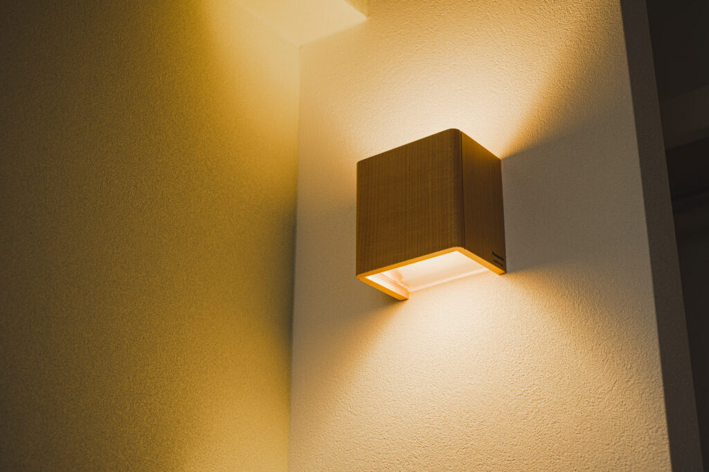 灯りが壁をなぞり、素材を引き立て、住まいに奥行きを生み出しています。