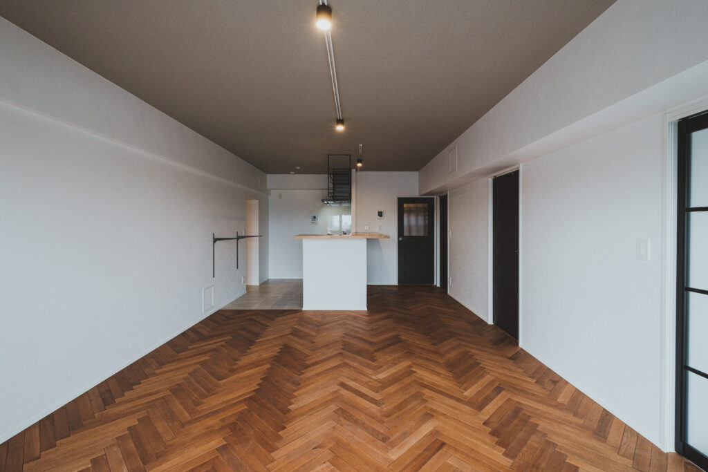 LDKでまず視線を奪うのは、ヘリンボーン貼りのフローリング。