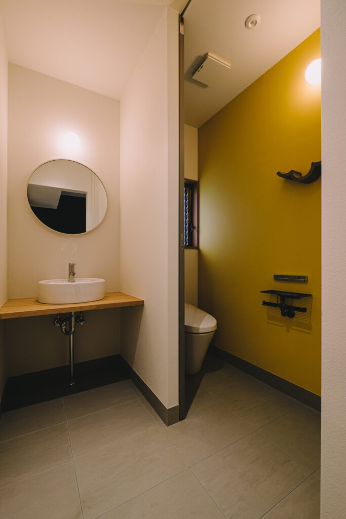 トイレには、鮮やかな黄色のアクセントクロスを採用。