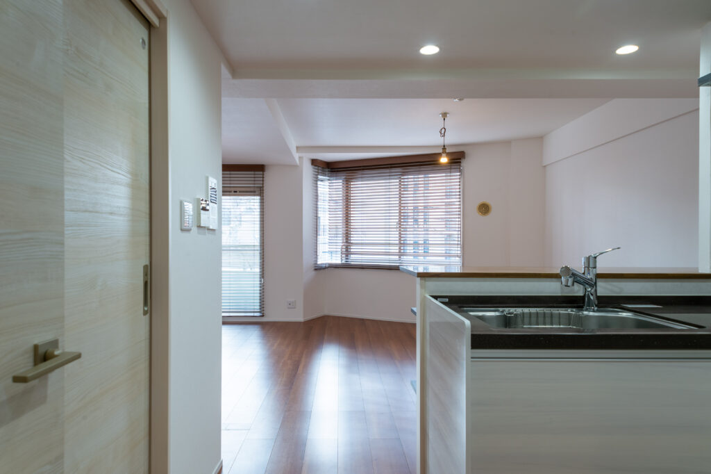 リビングの間仕切り壁と可動棚は全て取り払い、リビングダイニングを美しく整えました。