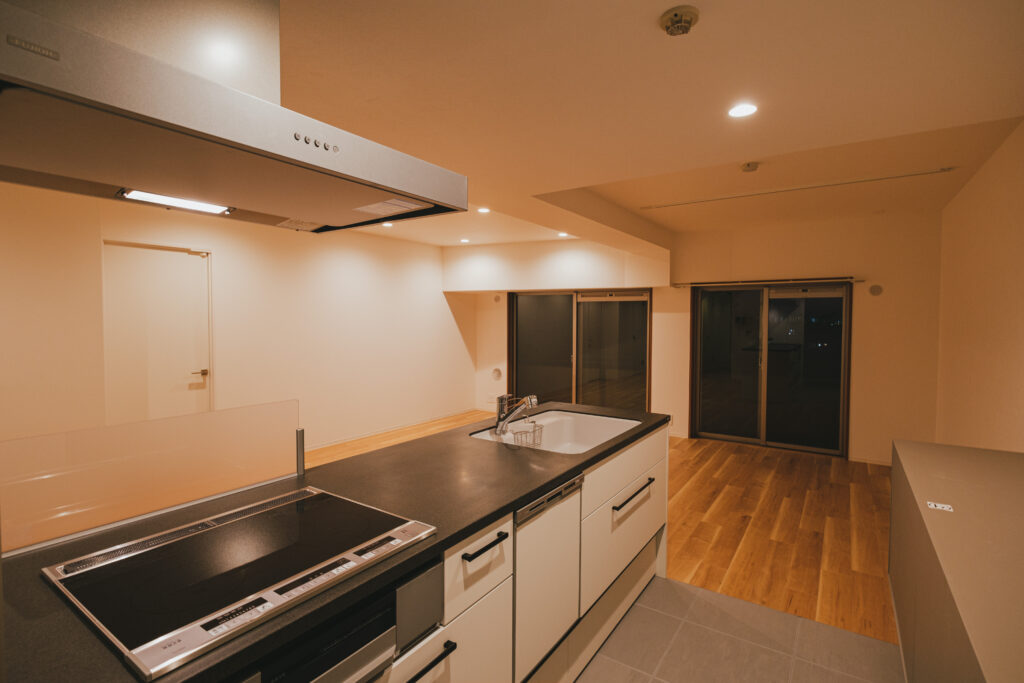 シンプルながらも強い存在感を放つキッチンが完成しました。