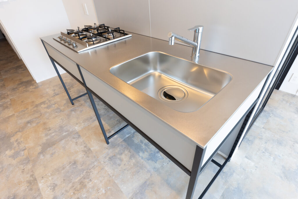 ステンレスやグレーを基調とした素材感が、光を反射して静かな高級感と透明感をもたらします。