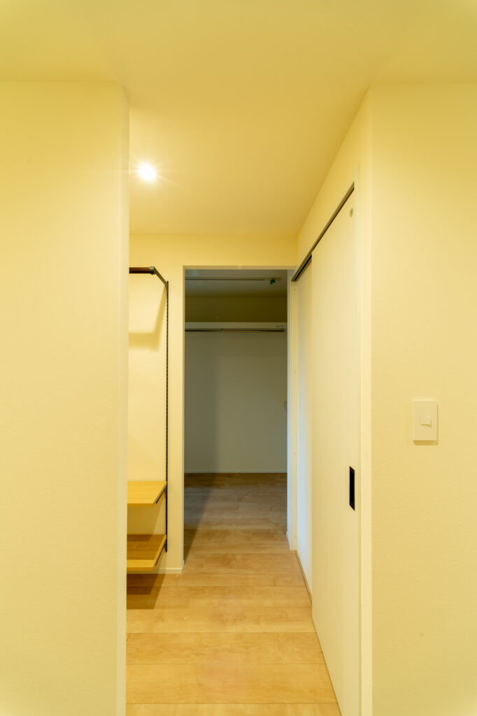 洗濯から収納までスムーズに進むよう、引き戸と開口で裏動線を確保しています。