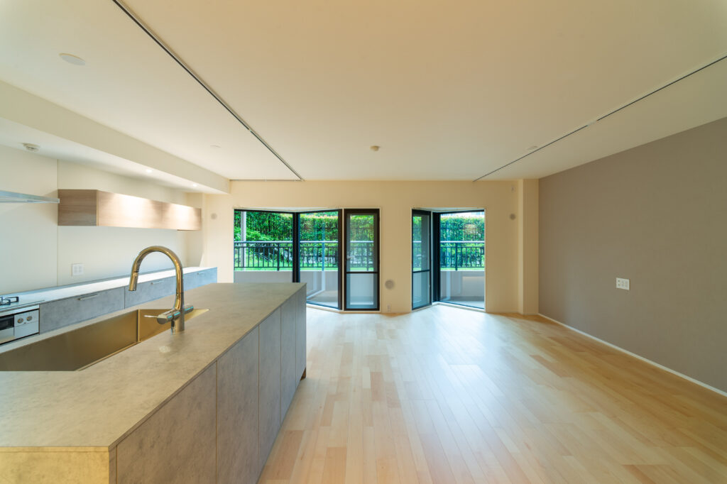 グレーと木目を基調にまとめたLDKは、緑を感じられる空間に。