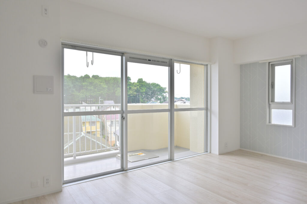 主寝室側にはルーバー建具を、リビング側には大面積のガラス建具を配し、自然な空気の流れと明るい採光を両立。