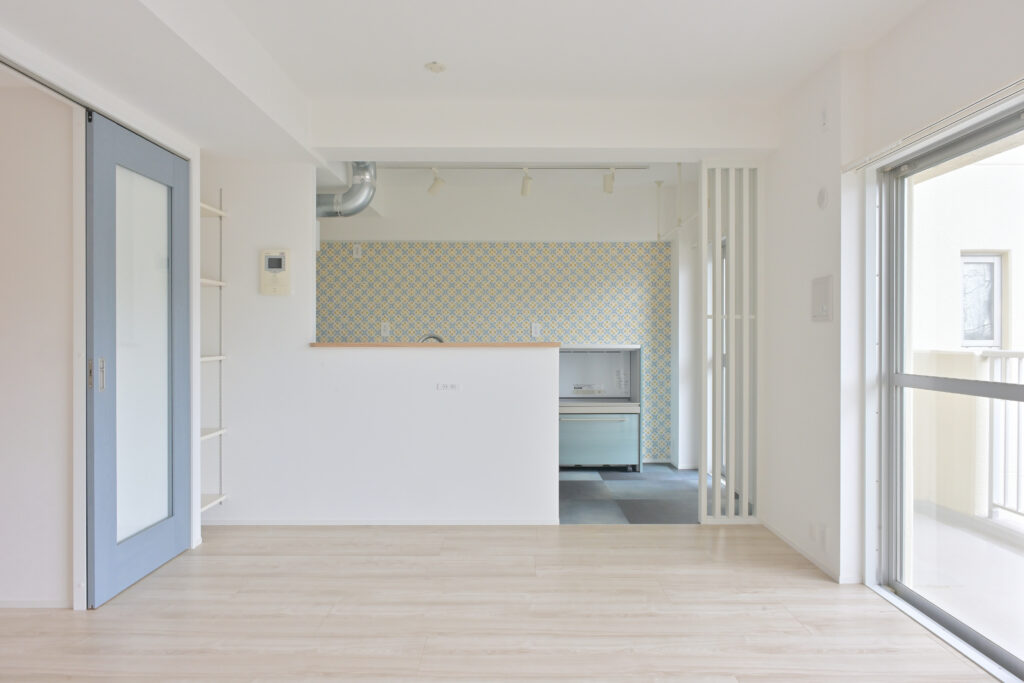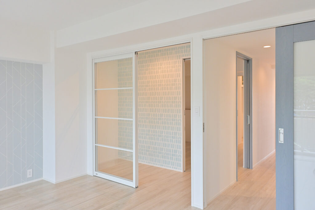 LDKをはじめとする室内各所には、ブルーベースの建具を配置。