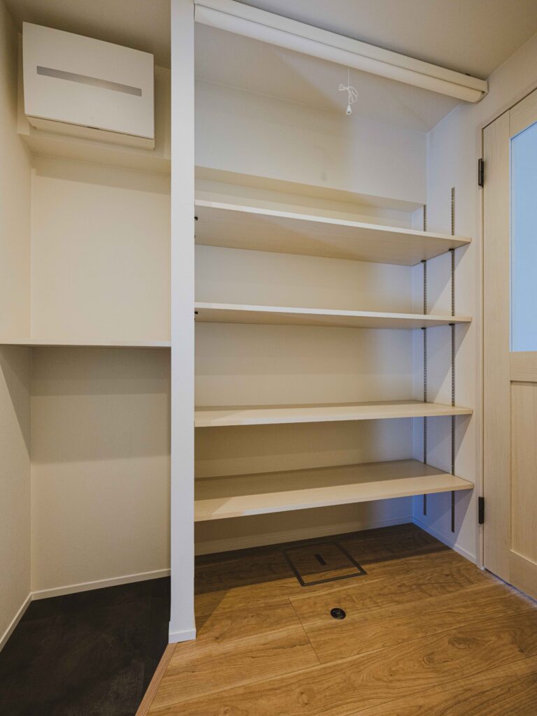 玄関ホールの横に設けたのは、幅広の可動棚。