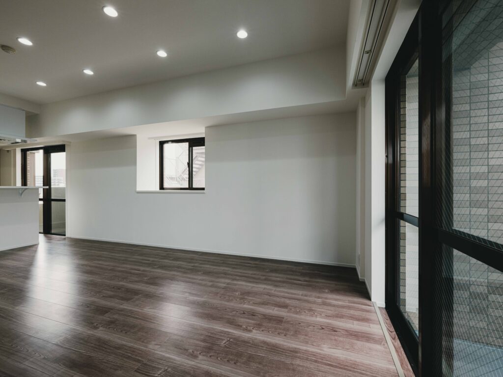 二面採光の明るい窓から差し込む柔らかな光は、キッチンからリビングまで照らします。