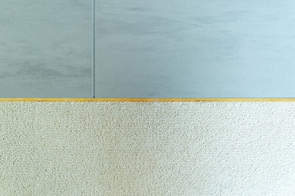 異なる素材を結ぶ見切り材には真鍮をあしらい、わずかな高さの違いも美しくフラットに。