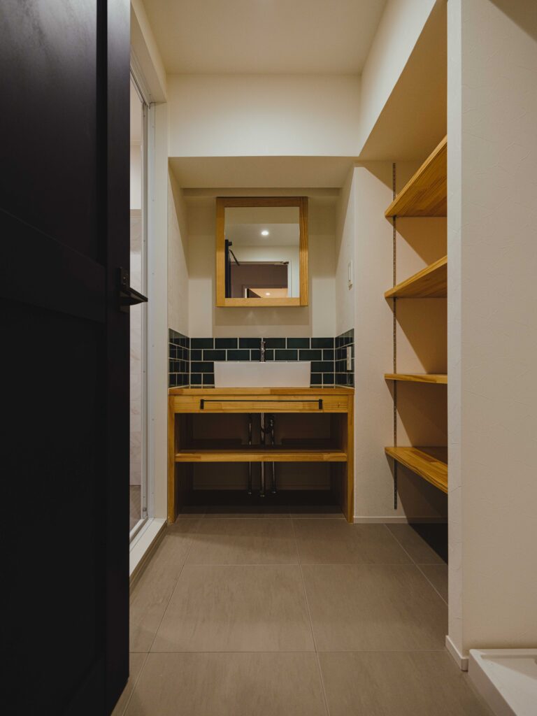 床にはダークトーンのヘキサタイルを使い、色味がキリッと引き締まります。