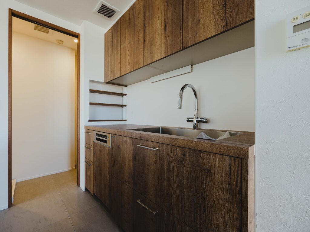 吊戸棚やフロントオープンの食洗機を配置し、家事の効率を高めながら、見た目の美しさも維持しています。