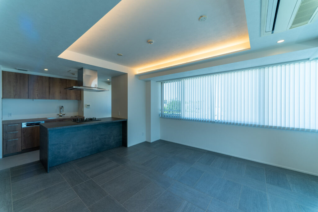 LDKの中心は、石貼りの床とフラットなペニンシュラ型キッチン。