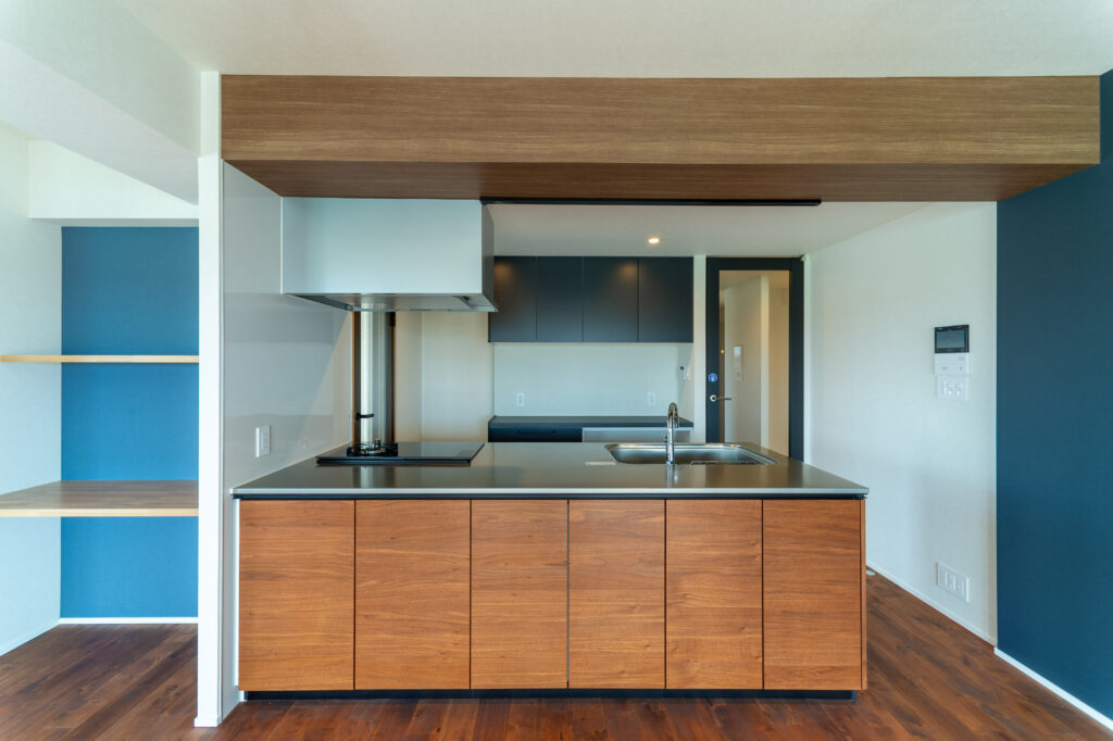 フローリング、キッチン、壁やドアのアクセントは木目調で統一。