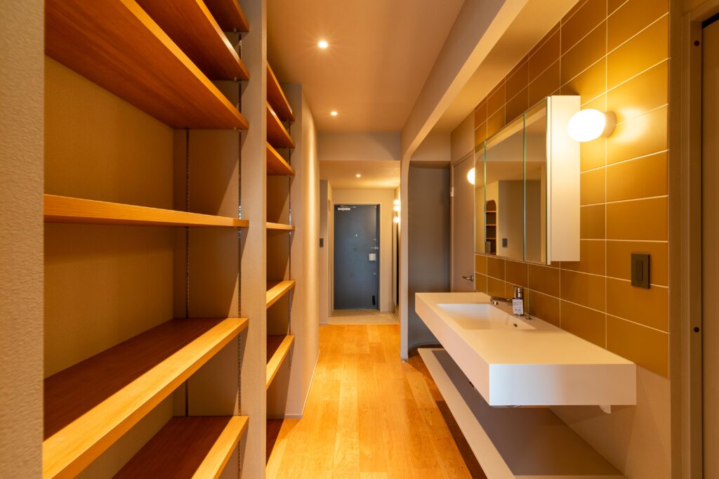 廊下の浮いた洗面カウンターや、アール壁の裏に設けた半分隠した収納もオリジナル。