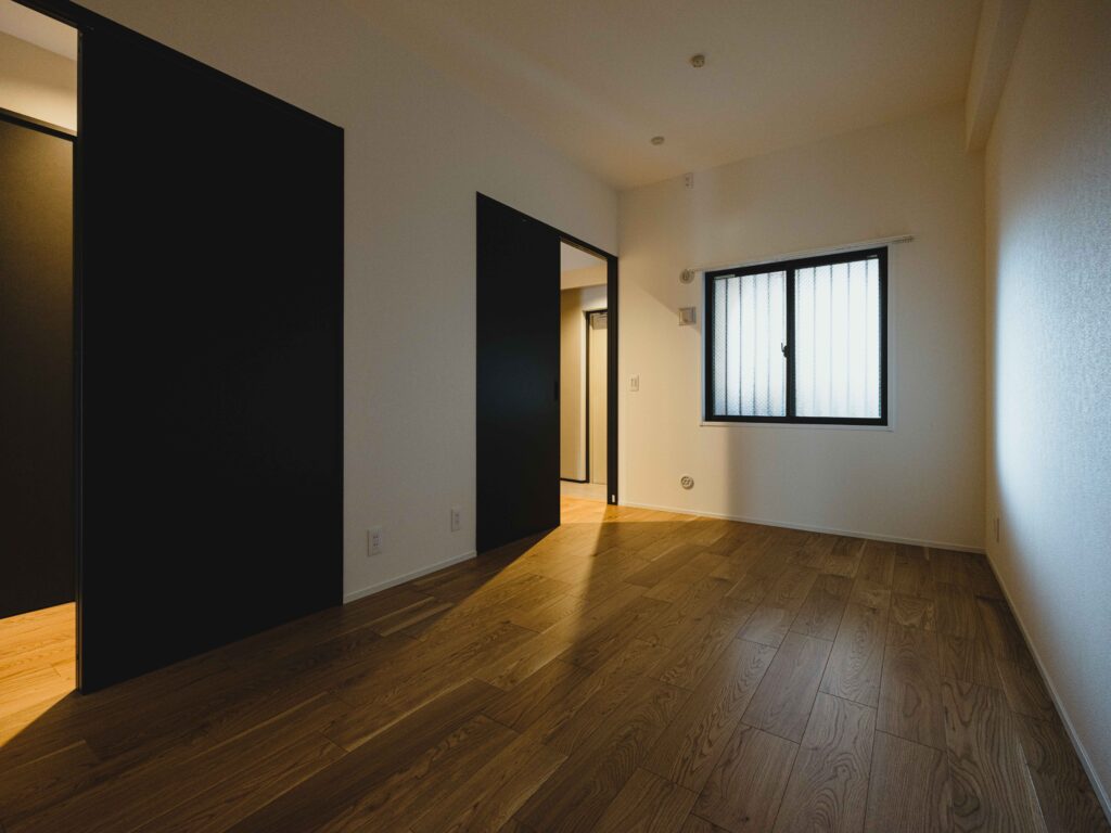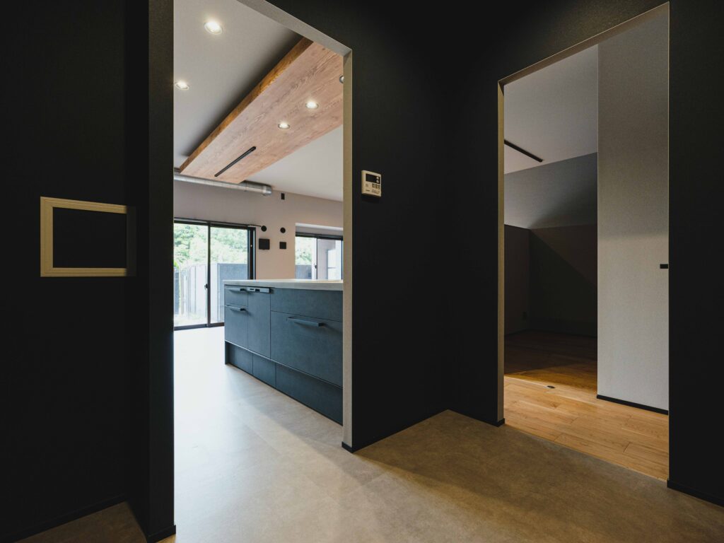 内装は、全体的に暗めの内装をご希望で、メインのクロスをグレーとし、建具や巾木を黒で統一しました。寝室はより暗くしたいイメージでしたので、アクセントクロスをよりダークなブラウンを選びました。