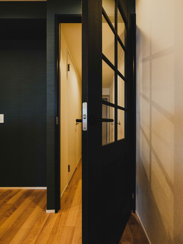 リビングと廊下の境目には、すりガラス入りのアンティーク風ドアを採用。