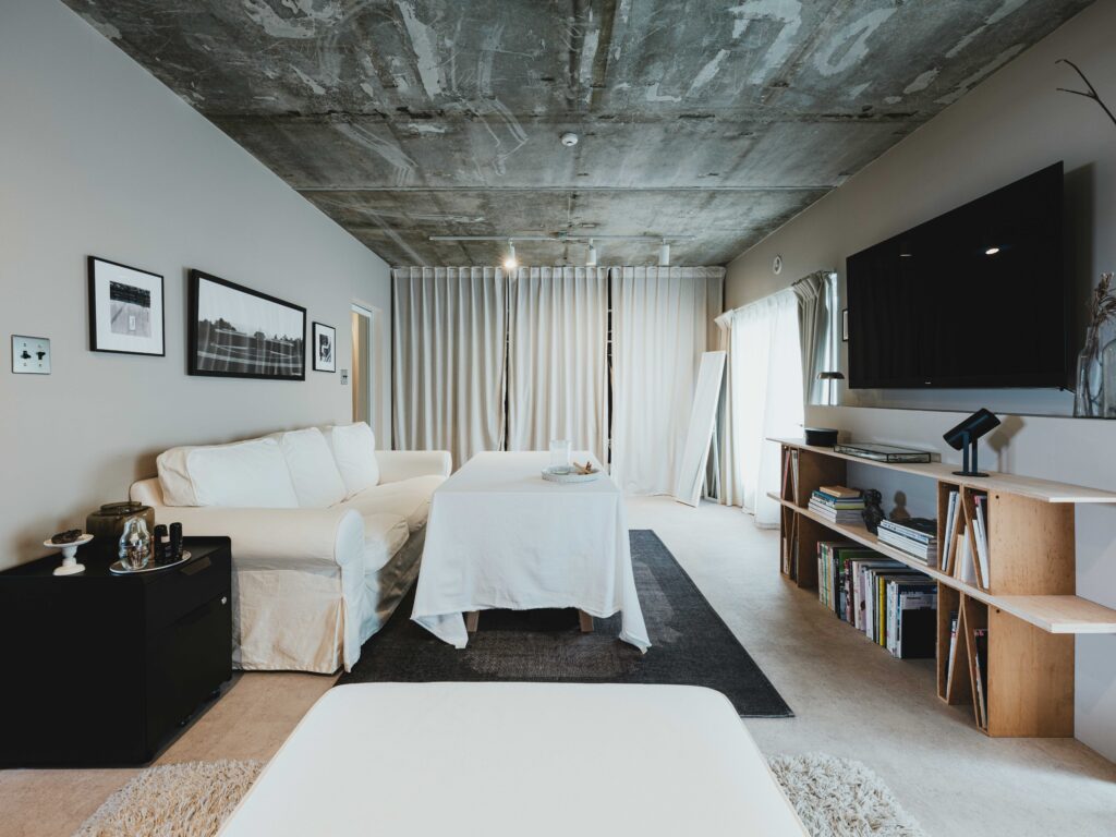 梁の粗いコンクリートの質感や、木目仕上げの造作棚も完備しました。