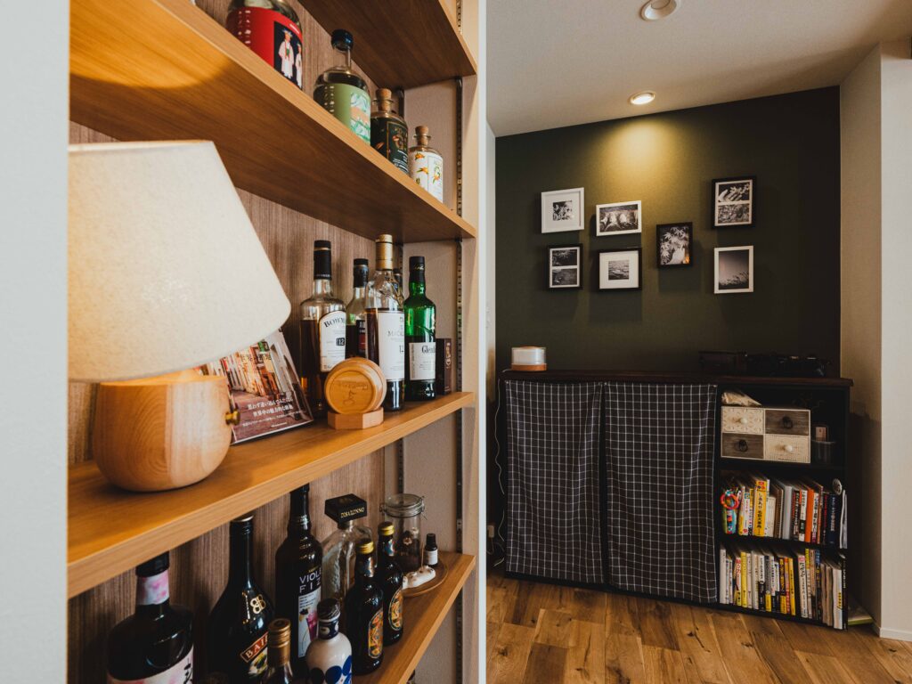 お酒や小物を引き立てる舞台となり、空間に立体感と趣を加えています。