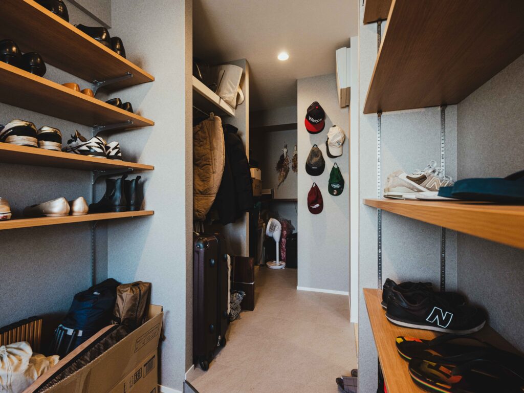 シューズインクローゼットにはキャンプ用品もすっきり収まるよう、大容量になっています。