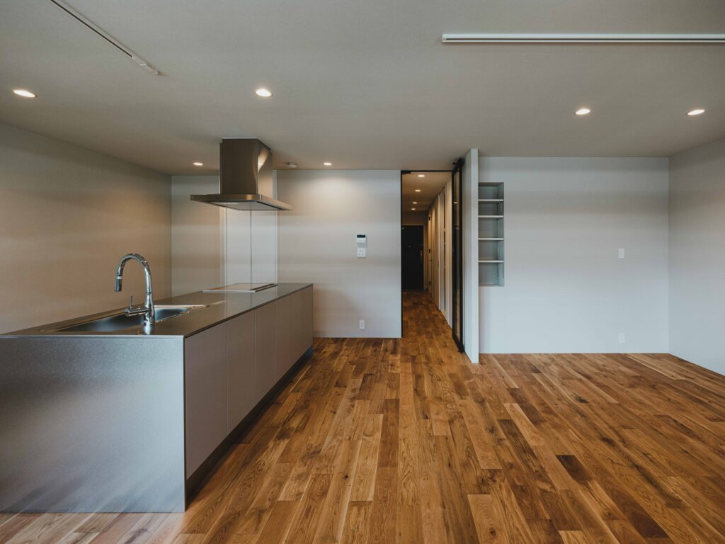 壁面には僅かにグレーを帯びた漆喰調の壁紙を選び、巾木レスの仕上げでスマートさと落ち着きを演出。