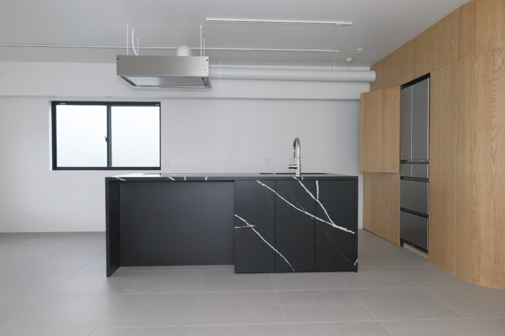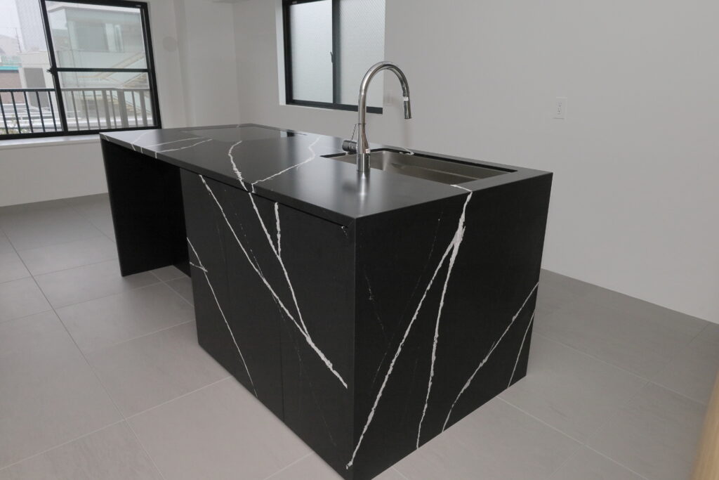 キッチンには、黒ベースに白いラインが入ったクオーツ天板を採用。