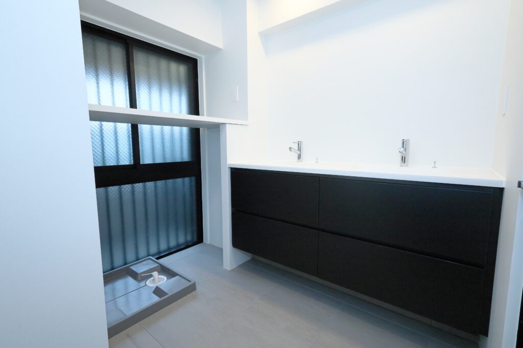 コンパクトながらも存在感のある洗面室は、ツーボウルタイプに。